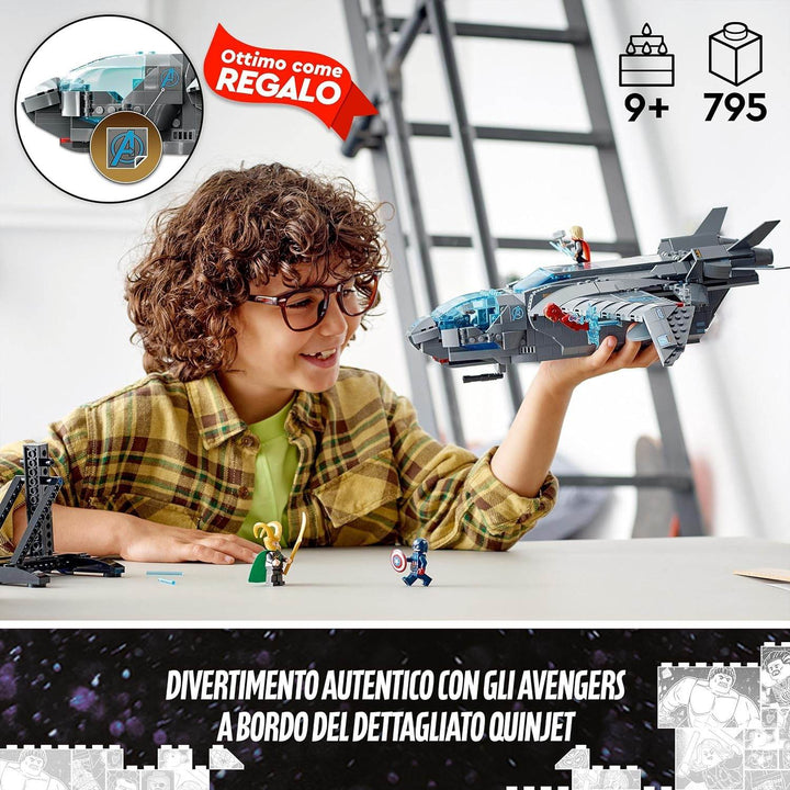 Build, play and display – This detailed recreation of the famous Quinjet aircraft has an opening cockpit, passenger area and rear section, plus a retractable undercarriage and adjustable wings