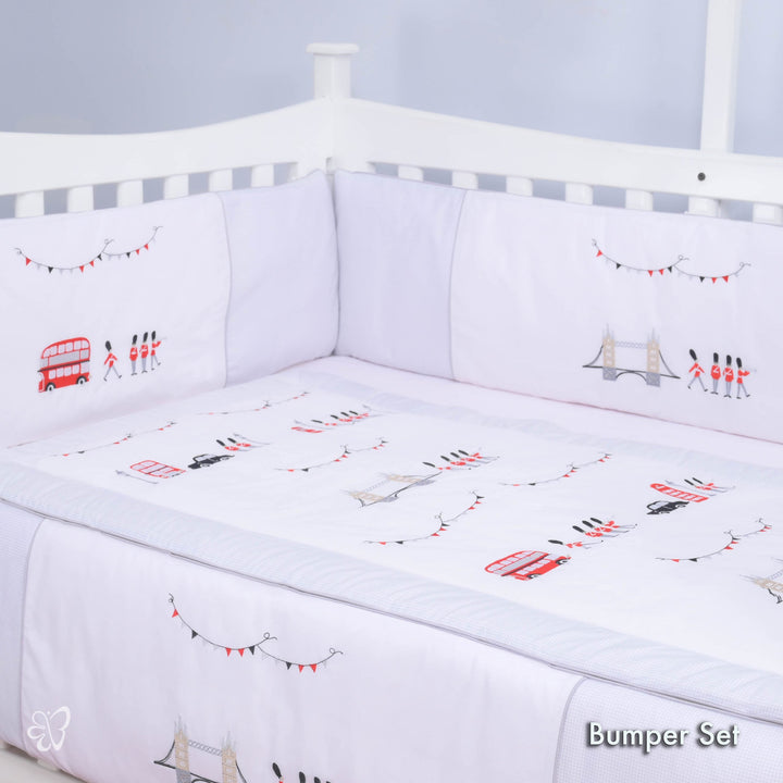 At Blooms and Butterflies, coziness is our design philosophy. Our London Bridge four piece Bumper Cover Set is made from 100% soft, breathable cotton material, providing a perfectly comfortable surface for your baby. Designed to fit most cots; secure the ties to the four sides of the cot and regularly check that they are tied in place for babys safety.