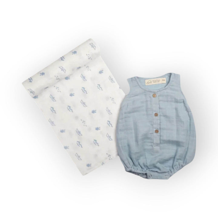 """It's a classic for a reason. One of our organic swaddle blankets gets perfectly paired with a cutest-of-cute, baby romper.