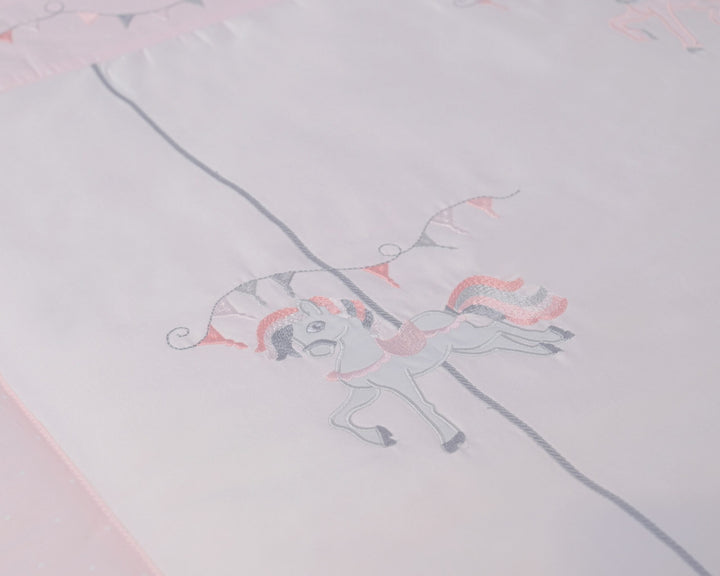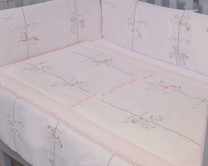 Our Merry Go Round Comforter provides an additional layer of comfort to the cot bedding and cosiness to the nursery. Made with 100% cotton fabric, it is soft, breathable, and perfect for your little ones delicate skin. The inner padding provides natural warmth and keeps the babys body temperature in its normal range. All materials used are clean, eco-friendly, and without any additional chemical treatments.