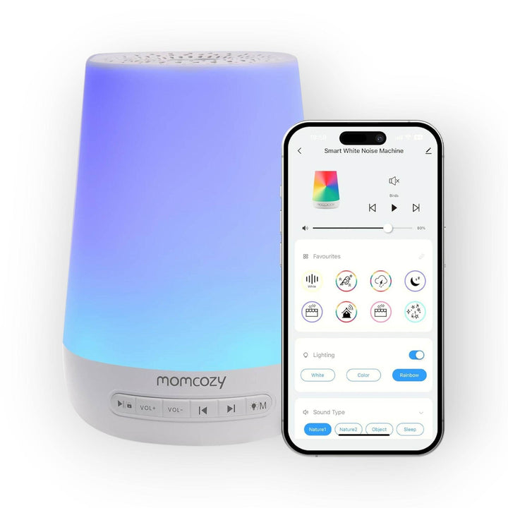 Discover tranquility with the Momcozy Baby Sound Machine. Boasting 34 high-fidelity white noise sounds and a gentle LED lamp in seven hues, it effortlessly harmonizes with your sleep routine.