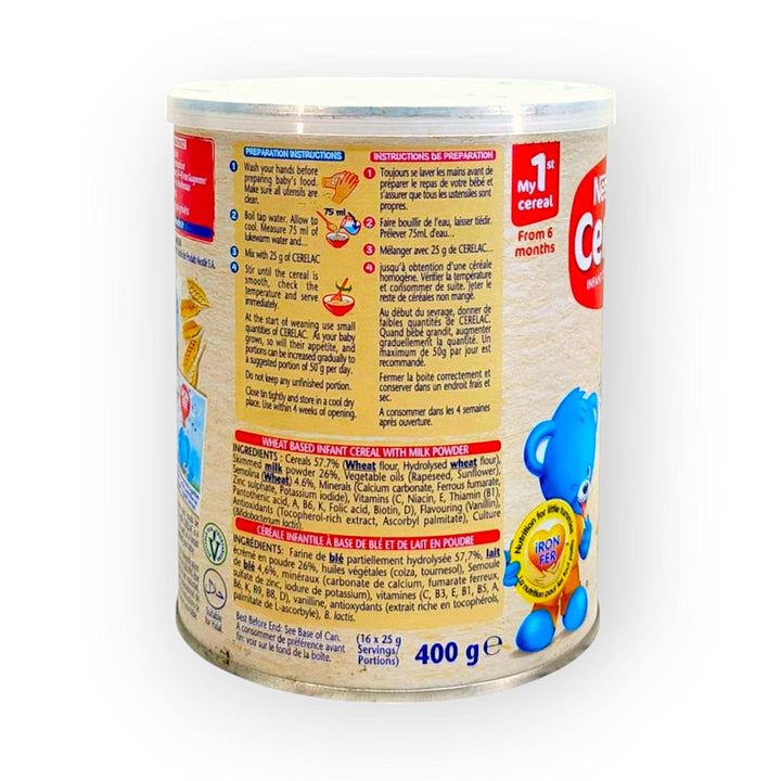 Nestle Cerelac Honey & Wheat Miel, Ble 400g A highly nutritious, instant cereal. Suitable for infants when breast milk or formula can no longer fully cover the nutritional requirements. Stage 1 – for babies from 6 months. Imported from Europe. Imported from USA. Nestle Cereal wheat 400g (England) is rich in iron, vitamins A, C, and B12. This milk powder is highly nutritious for babies from 6 months onwards when breast-milk alone or formula can no longer totally cover the baby’s growing nutritional requirement. Nestle.