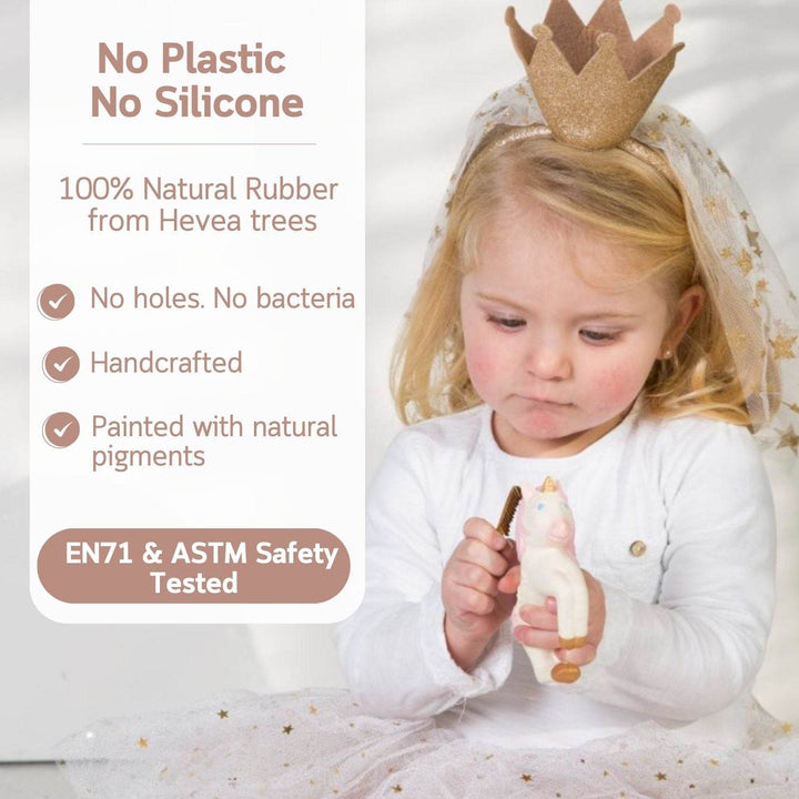 Stacy the Unicorn will make your baby sparkle wherever he goes! It will become babies and kids’ favorite teether, bath toy and sensory play toy. This chewable bracelet is meant to be placed around babies’ wrists while teething on it!