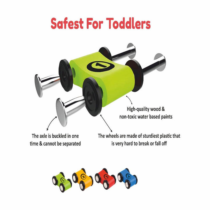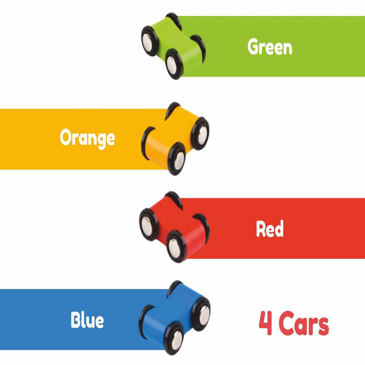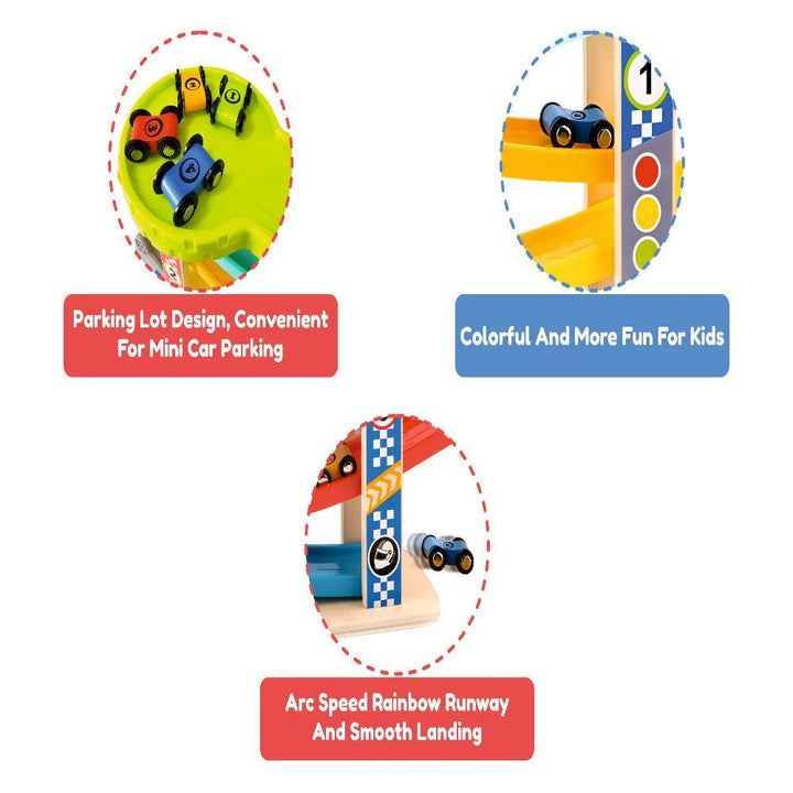 This Open Ended Rolling Ramp Racer includes a 6-ramp race track, a parking lot at the top of the structure, and 4 wooden mini toy cars, each with a different color and number. The colorful ramps, installed at angles, allow cars to descend smoothly and excitingly; two ramps have an adjustable slope that the child can control to increase or decrease the speed of the vehicles. The car wheels are made of sturdy plastic and are securely attached to the bodies of the cars by permanently joined axles. The vibrant colors increase the fun and stimulate children visually to engage them better in their game. This toy helps kids improve their hand-eye coordination, motor skills, and problem-solving abilities. It also boosts their imagination, creativity, focus, and social skills. The playset is mainly pre-assembled; only the parking lot is to be installed. Made of quality wood and sturdy plastic with smooth edges and painted with non-toxic water-based paint for increased safety. Suitable for kids 18 months and older.