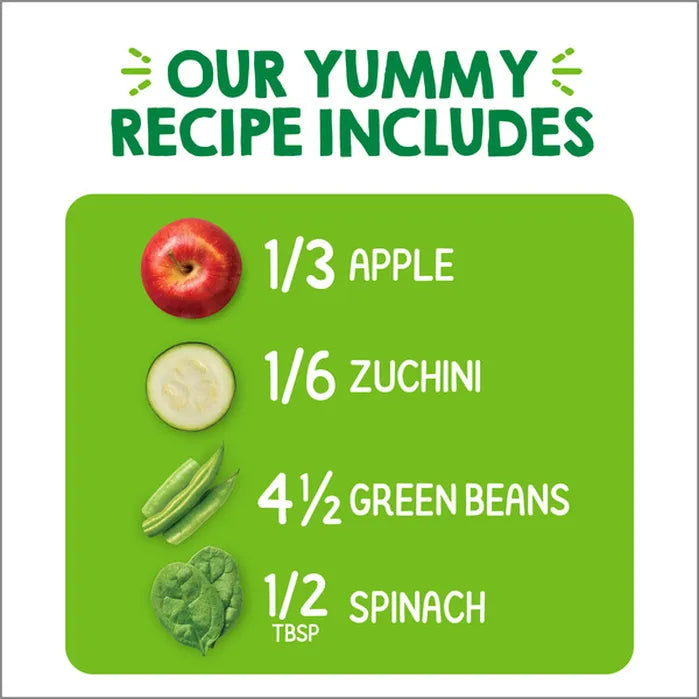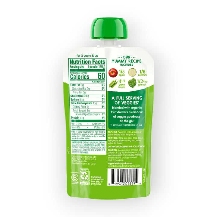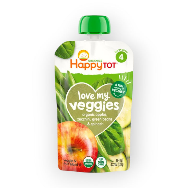 Organics Happy Tots Apples, Zucchini, Green Beans & Spinach Puree is a nutritious, organic snack designed for toddlers aged 2 years and older. Packed in a convenient 120g pouch, this Stage 4 puree combines the natural sweetness of apples with the earthy goodness of zucchini, green beans, and spinach, offering a full serving of vegetables in every pouch. Made with 100% USDA organic and non-GMO ingredients, it is free from artificial additives, preservatives, and the top 9 allergens, making it a safe and wholesome choice for growing kids. The smooth yet hearty texture is ideal for toddlers who are used to more complex flavors and food combinations. Perfect for on-the-go snacking or as a supplement to regular meals, this veggie-rich blend supports healthy eating habits from an early age.