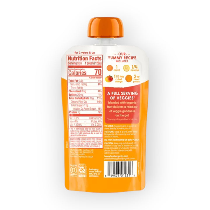 Organics Happy Tots Carrots, Bananas, Mangoes & Sweet Potatoes Puree (120g) is a nutritious and delicious snack specially crafted for toddlers aged 2 years and older. Made with a wholesome blend of organic fruits and vegetables, this puree combines the natural sweetness of bananas and mangoes with the earthy goodness of carrots and sweet potatoes. It contains no added sugars, artificial flavors, or preservatives, making it a healthy choice for growing children. Rich in vitamins and fiber, it's perfect for on-the-go snacking or as part of a balanced meal, supporting your toddler’s development with every tasty spoonful.