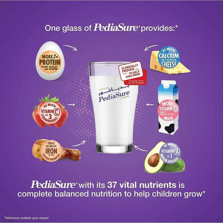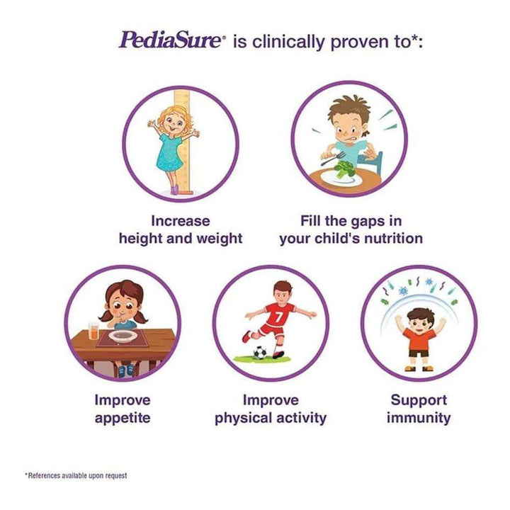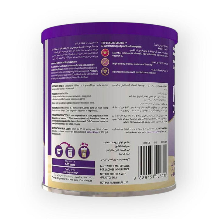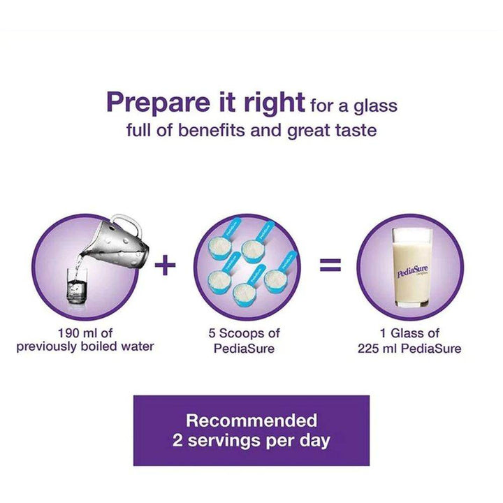 PediaSure is clinically proven to fill the gaps in your child’s nutrition. PediaSure with Triple Sure has 37 Nutrients to support growth and development Essential vitamins & minerals to support catch-up growth. High-quality protein, calcium and vitamin D to support bone growth Balanced nutrition with prebiotics and probiotics to support immunity Suitable for children 1 - 10 years old and can be used as a nutritional supplement with or between meals. Prepare it right with 190ml (pre-boiled) water and 5 scoops of PediaSure to make a drink of 225ml.