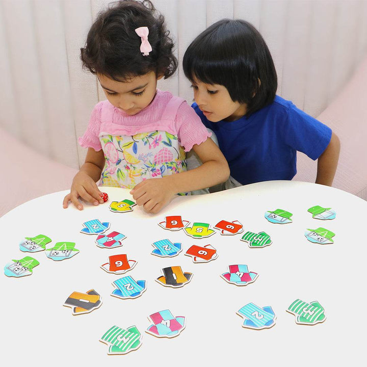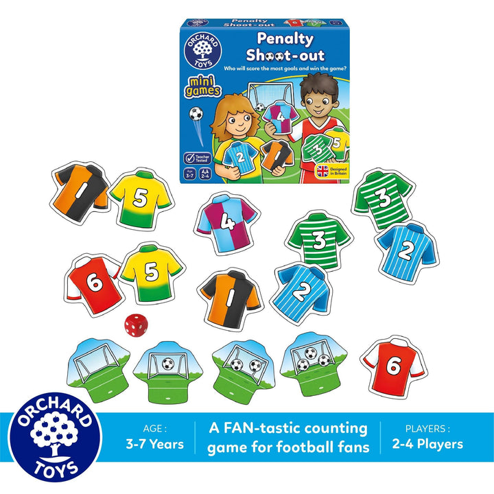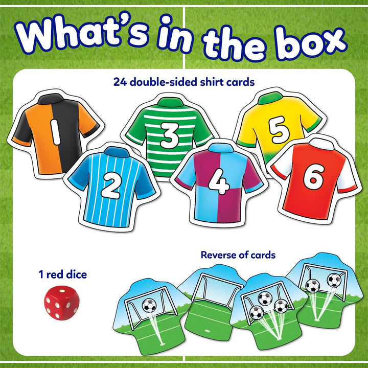 Roll the dice and match the spots to the number on the football shirt. At the end of the game it's the number of footballs on the back of the cards that will have the players running a victory lap around the living room!