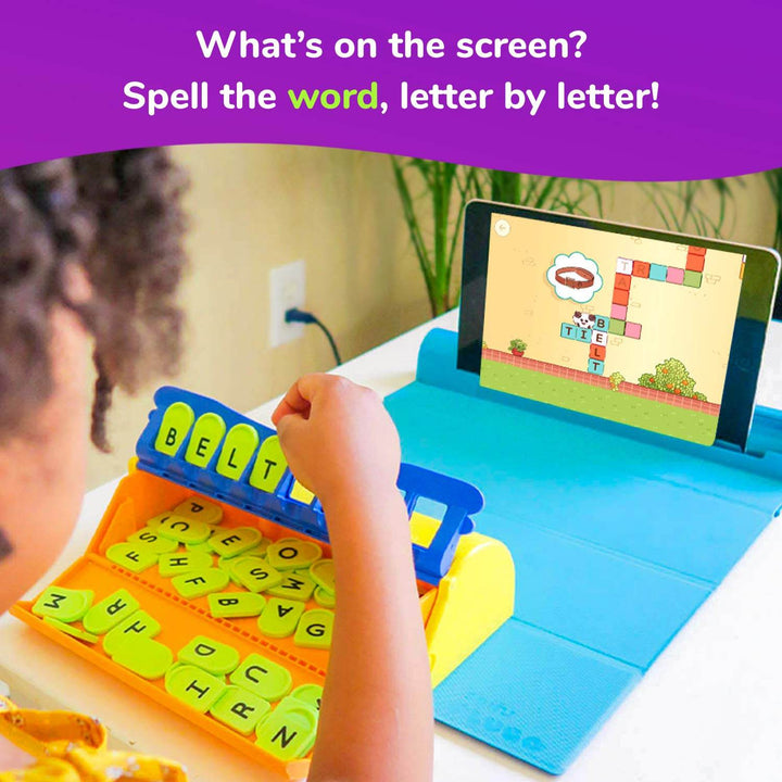 IN THE BOX - The kit contains a Letters Trunk and 48 letter tiles. Spell with tiles on the Trunk, and put them all inside to store away. It comes with the Plugo gamepad, a foldable mat with embedded magnets to hold the Plugo kit on one side, and your device goes in the slot on the other side. Hands-on learning without touching the screen! (The box doesn?t come with a tablet/smartphone).