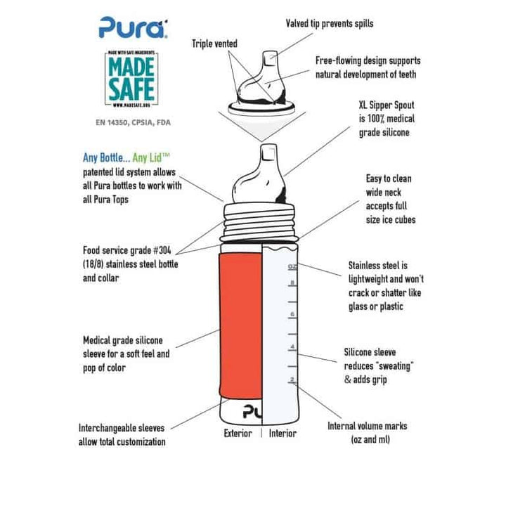 Our award winning 9oz Insulated Kiki sippy bottle is 100% plastic-free, environmentally progressive, and adapts to the needs of your growing child. Both the bottle and collar are crafted from safe, high grade #304 stainless steel and our XL Sipper Spout™ is made from medical grade silicone. With Pura, you can be sure you are getting the safest bottle on the market (BPA/BPS-free and MadeSafe Certified).