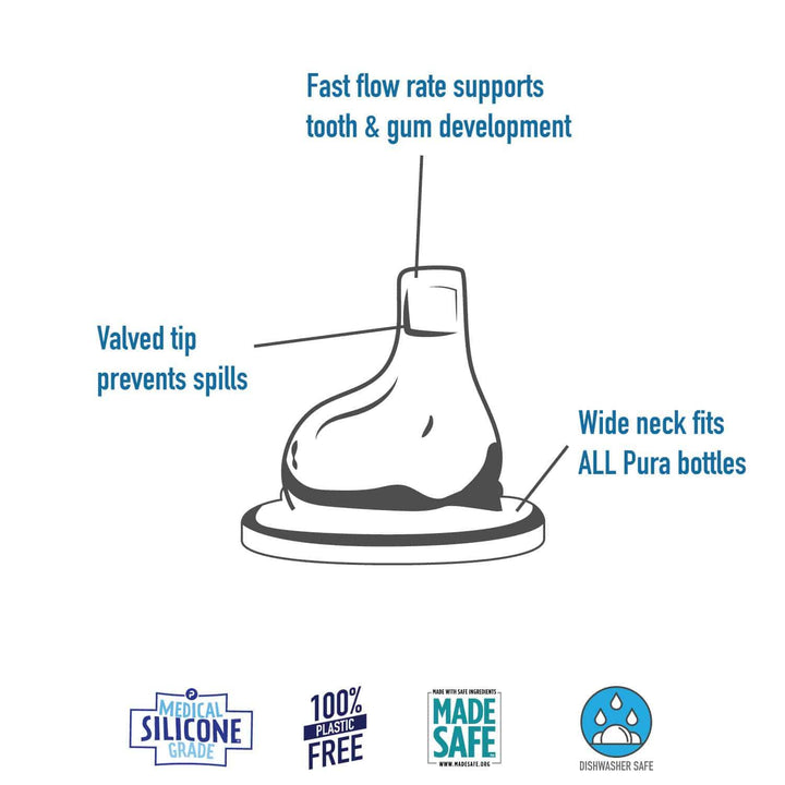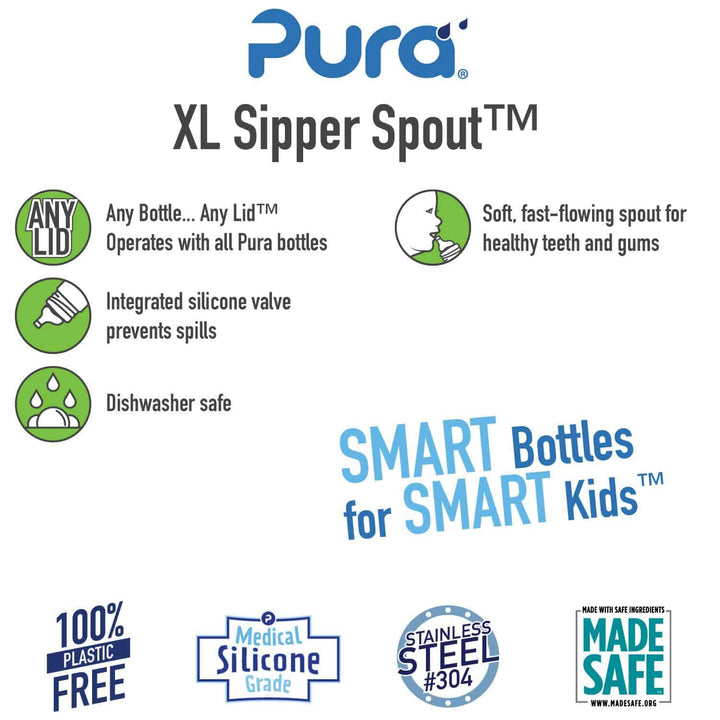 Our design and development team took up the challenge of creating the best non-plastic sip spout on the market. In accordance with the desires of leading pediatricians, our new XL Sipper was designed to be stiff and free flowing to support the natural development of teeth and gums in toddlers. Noting that most silicone spouts were fragile, we also reinforced the tip of the spout to better withstand the teething instincts of growing toddlers.