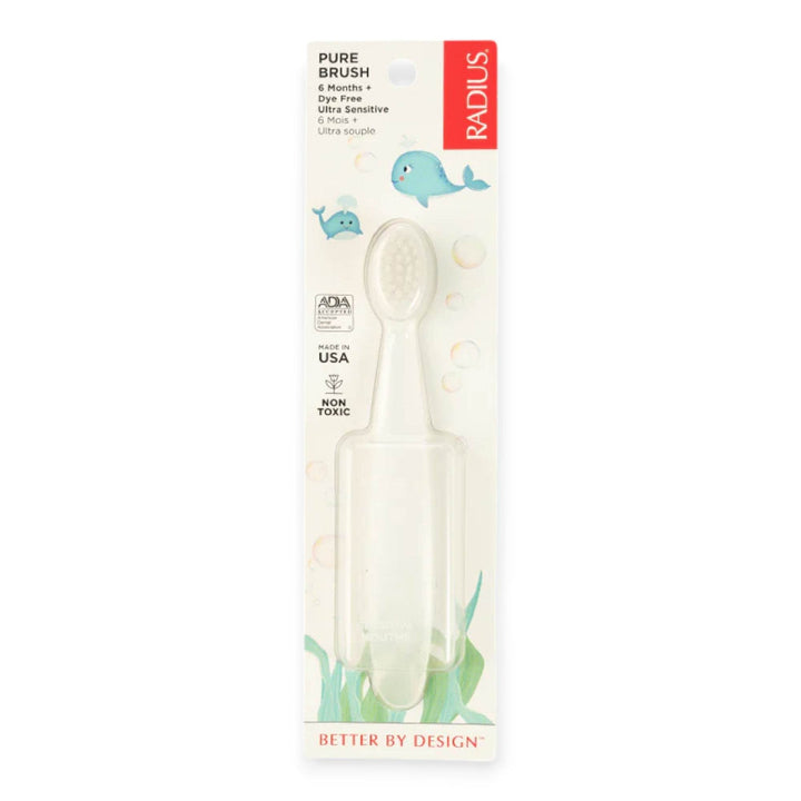 As sensitive as it is effective, the Pure Brush is exactly that — a baby toothbrush, free of BPA, dyes, and harmful chemicals. Designed for the delicate teeth and gums of 6+ month olds, it softly massages the whole mouth as it works to remove plaque buildup on your little one's tiny teeth.