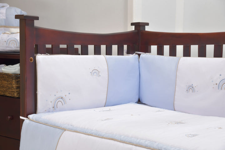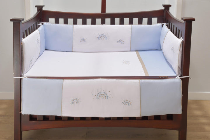 At Blooms and Butterflies, coziness is our design philosophy. Our Rainbow Blue four piece Bumper Cover Set is made from 100% soft, breathable cotton material, providing a perfectly comfortable surface for your baby. Designed to fit most cots; secure the ties to the four sides of the cot and regularly check that they are tied in place for babys safety.
