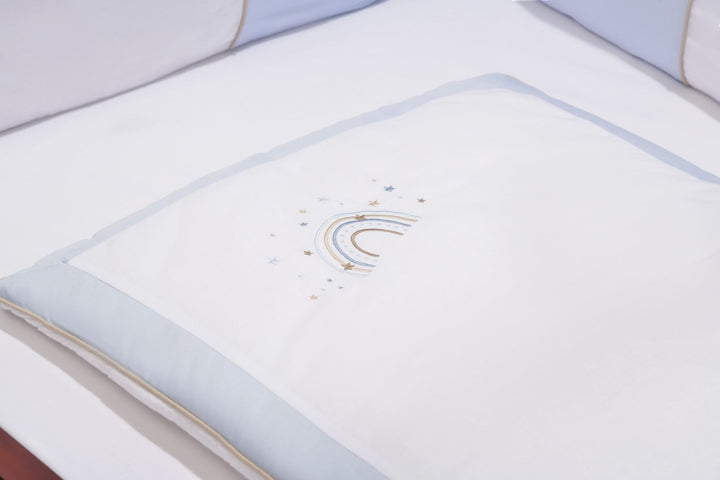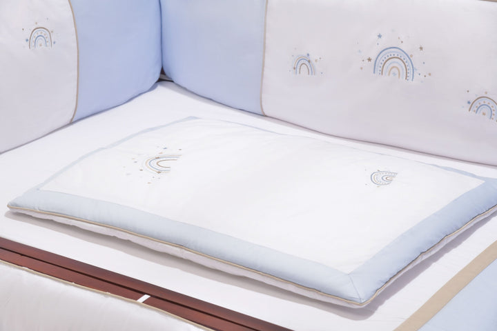Our Rainbow Blue Quilt is essential for any new mum or dad; its plushy cosiness will help keep the little one safe and warm during their first three months. Made with 100% cotton fabric, it is soft and breathable, perfect for the babys delicate skin. The inner padding provides natural warmth and keeps the babys body temperature in its normal range. All materials used are clean, eco-friendly, and without any additional chemical treatments.
