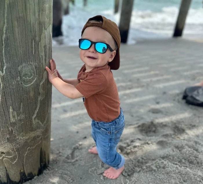 Roshambo's design prioritizes safety. These baby blue mirrored sunglasses provide 100% UVA/B/C protection to keep your baby's eyes safe from harmful rays. Your baby’s eyes are sensitive, so safeguarding them is essential. These shades are not only a protection tool but also a fashion statement for your little trendsetter.