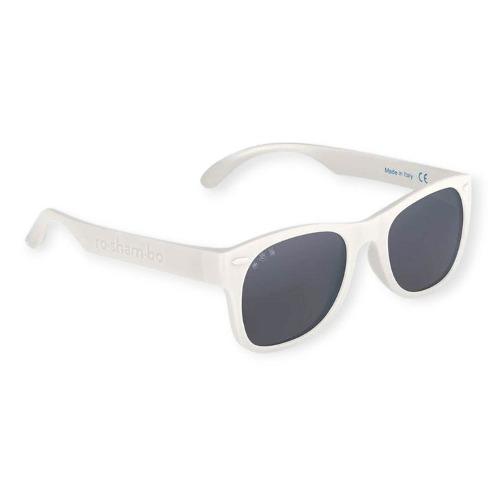 The Roshambo Ice Ice Baby White Shades - Toddler (2-4 Yrs) - Polarized Grey are the perfect blend of style, safety, and comfort for your little one. Designed with a classic bright white frame and cool grey polarized lenses, these shades offer 100% UVA/B/C protection to keep delicate toddler eyes safe from harmful sun rays. The flexible, lightweight, and virtually unbreakable frame is specially crafted to withstand rough toddler play, while the soft, pinch-free design ensures all-day comfort. Whether it's a sunny day at the park or a family outing, these shades are built for fun, function, and fashion—keeping your toddler looking cool and feeling protected.