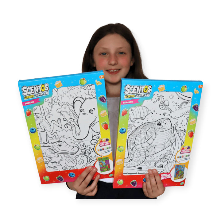 Paint your own Jungle scene canvas picture using the very fun scented activity set from Scentos. This Scentos On-The-Go Jungle mounted Canvas Art Picture comes with Pre-printed Jungle theme canvas picture, 6 deliciously fruity-scented Scentos paint pots and 2 brushes. The paints are scented with fragrances like banana, apple, blueberry, orange and strawberry and are completely safe and non-toxic for use by children. Suitable for kids aged 3 years and above. A canvas with water colours and brushes; if this is not the perfect way to bring your favourite jungle scene to life, then what is?