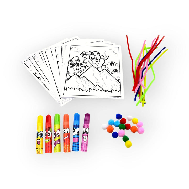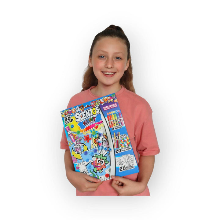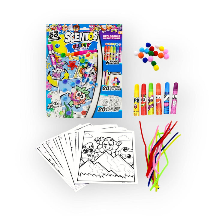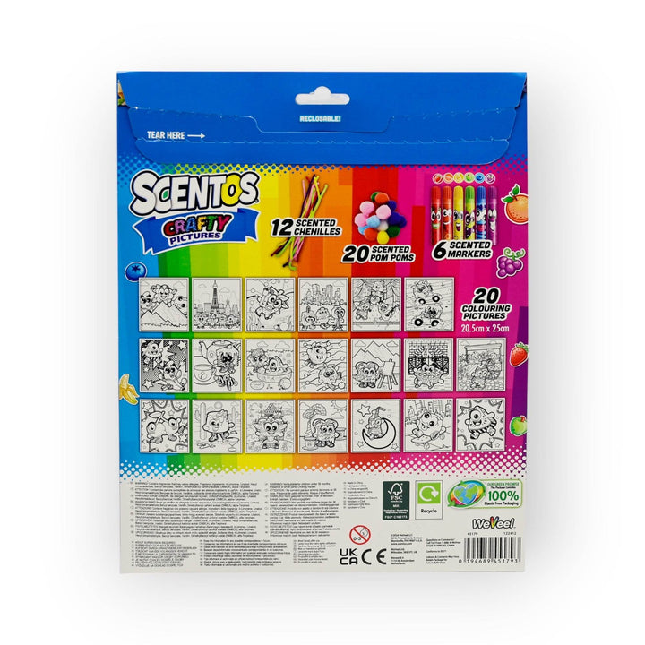 Scented activity fun. Crafty pictures activity. Includes 20 colouring pictures, 6 scented markers, 12 scented chenilles, 20 scented pom poms, The markers are scented with fragrances like banana, apple, blueberry, orange and strawberry and are completely safe and non-toxic for use by children. Suitable for kids aged 3 years and above, Reclosable pack for easy storage and on the go fun.