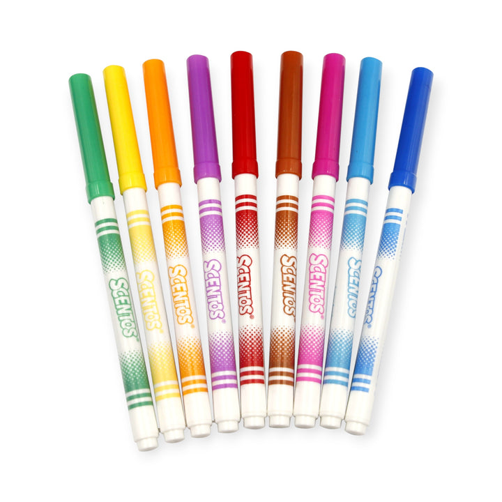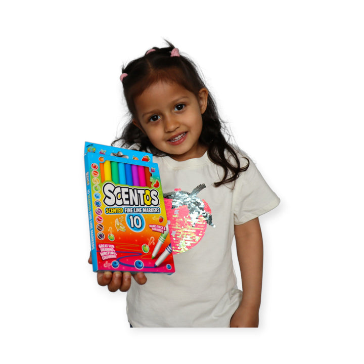 From the premium scented stationery brand Scentos, this pack of scented fine line markers contains 10 different sweet-scented marker colors that can make both thick and thin lines! The fine line tips offer greater control over detail and hence, your child will love drawing, coloring, and creating away with this pen set. Great for backpacks, school, play and travel and completely safe and non-toxic for kids of ages 3+ years. Featuring classic, premium fruity and sweet scents like Strawberry, orange, banana, apple, blue rasperry, blueberry, grape, watermellon, chocolate and blackberry, let your child create a scented pieces of art and enjoy the thrill.