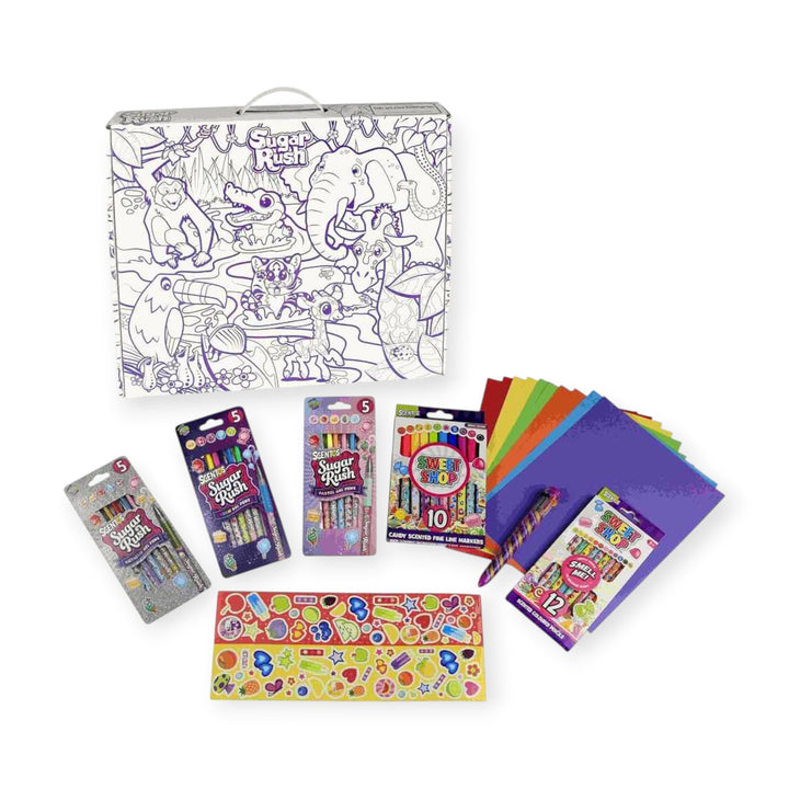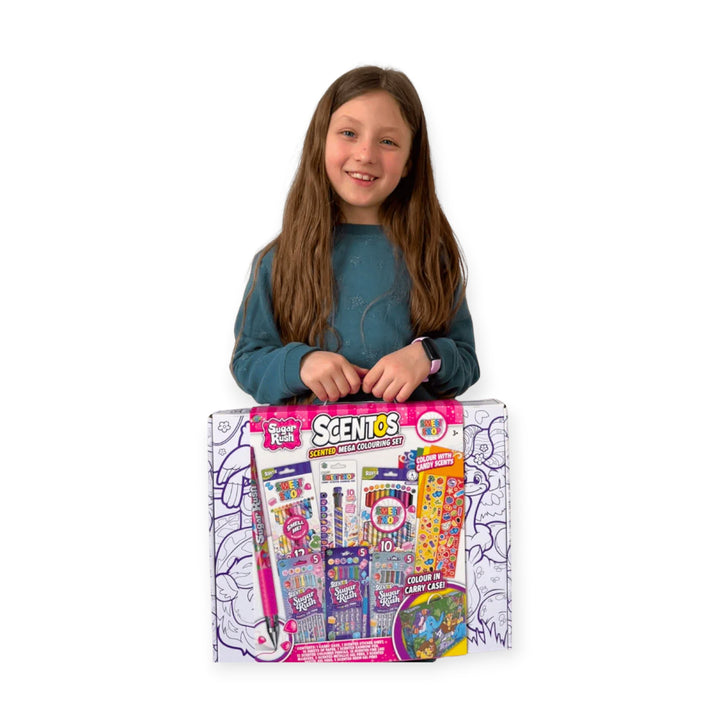 Enjoy candy sweet scents as you get creative and crafty with this huge Scentos Sugar Rush Sweet Shop Scented Mega Colouring Set. Perfect as a gift for kids on their birthdays and on festivals. The box has everything needed to keep kids entertained for hours and it comes with a ready to colour customisable carry case to inspire and spark creativity of your little artists. Designed in USA, completely safe and non-toxic for kids of ages 3+ years.