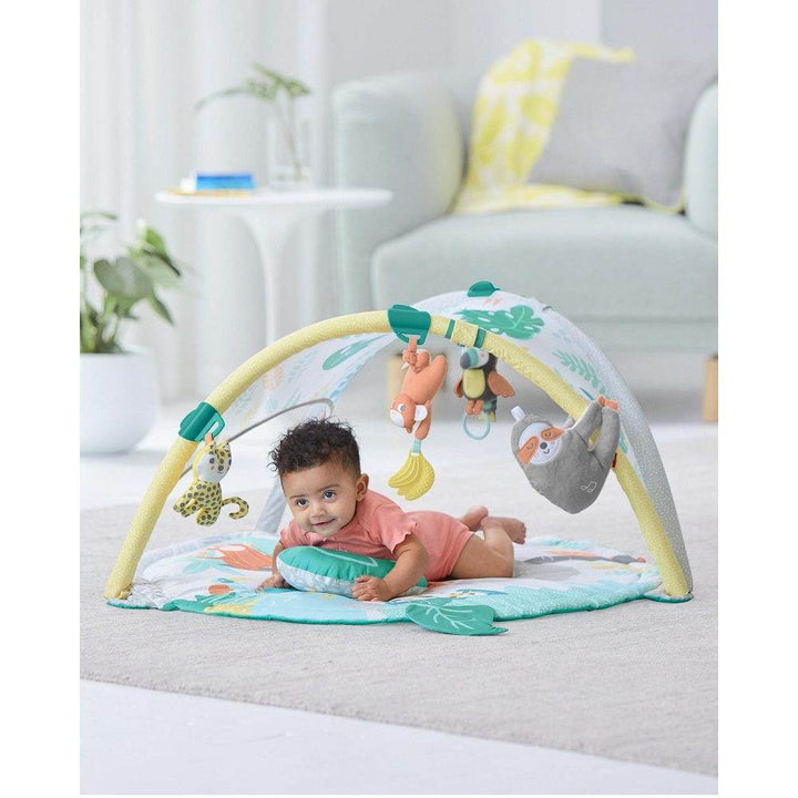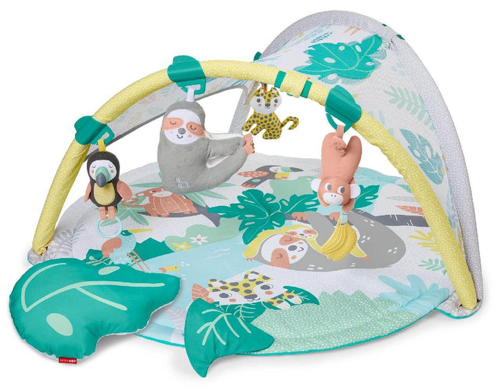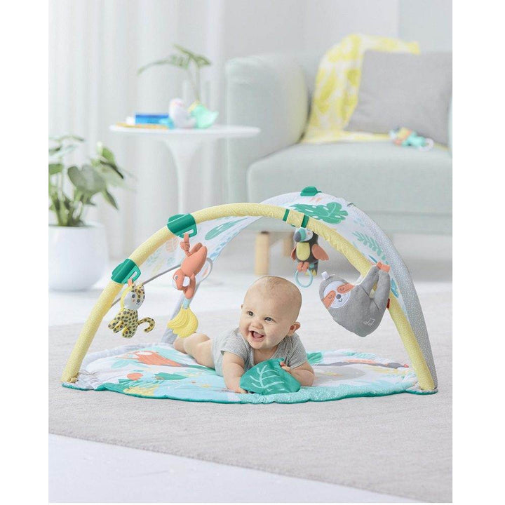 Turn playtime into a tropical adventure with lush leaves, cute animals and soothing sounds. Featuring beautiful artwork, a mesh canopy, and fun toys, this engaging activity gym also offers 2-in-1 versatility with a detachable sloth soother for on-the-go.