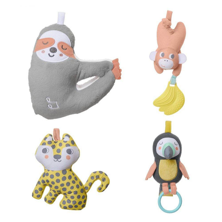- Four movable hanging toys include: Toucan with chime and grab ring, Monkey with squeaker and banana teether toy, Leopard with crinkle,