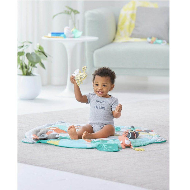- Comfy playmat with tropical artwork and peek-a-boo crinkle leaf