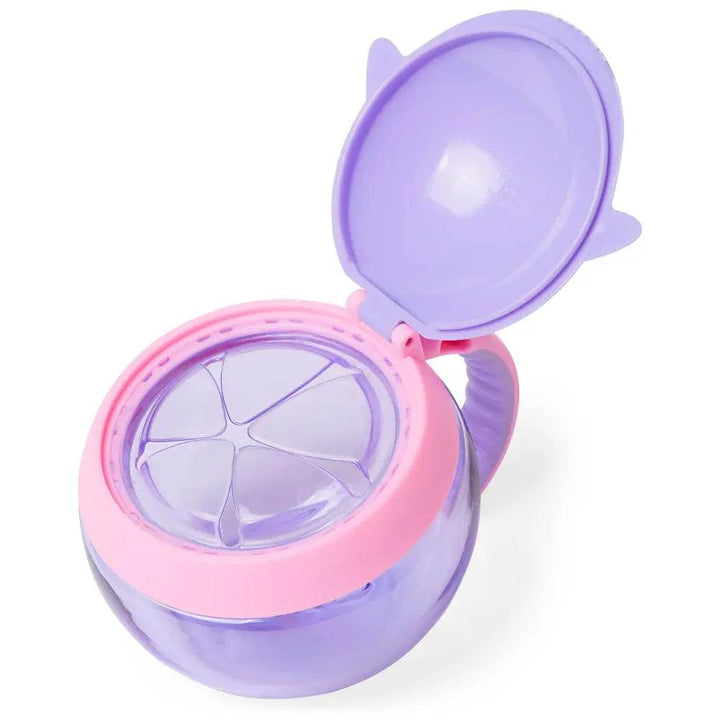 Skip Hop Zoo Snack Cup Perfect for toting munchies, this cute cup encourages independent snacking without the mess. The easy-grip handle is size adjust right for little hands, and the snap-top lid ensures food stays fresh. The flexible inside opening keeps snacks from spilling out - even if it's tipped over. With two lids there's less mess and mom's bag stays crumb-free!