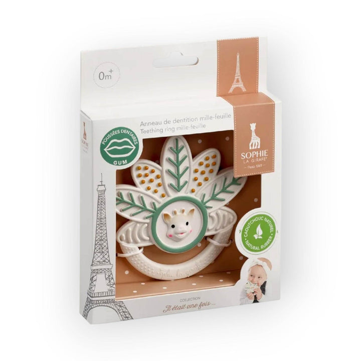 A 100% natural rubber teething ring with multiple textures to relieve baby's teething! The soft texture and its more or less long leaves are adapted to baby's mouth. They allow you to effectively massage baby's gums during the first teething sessions (incisors) or later (molars or canines). Easy to grasp by baby's little hands thanks to its handle.