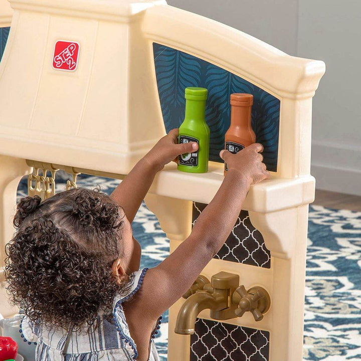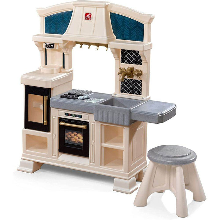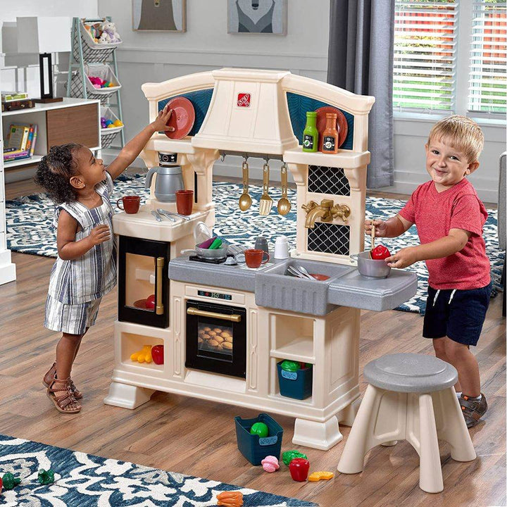 Junior chefs can play in style with the Classic Chic Kitchen by Step2. This kitchen playset for toddlers features beautiful details and plenty of activities! With pops of gold accents in the sink faucet, utensils, and appliance pulls, the deep blue hues and faux tile backsplash create a modern look. The gray countertop with a faux marble inset provides plenty of space to prep pretend ingredients. Serve up a favorite brew at the built-in coffee station or store essentials in the windowed refrigerator and storage bins. The pretend stovetop with real working lights and sounds makes cooking fun, and the included stool allows little ones to serve snacks at the breakfast bar. Friends can assist with whisking, scrambling, baking, and more! When playtime fun is done, built-in storage ensures everything is neatly stored after pretending to clean up with the large farmhouse-style sink. Made in the USA of US and imported parts.