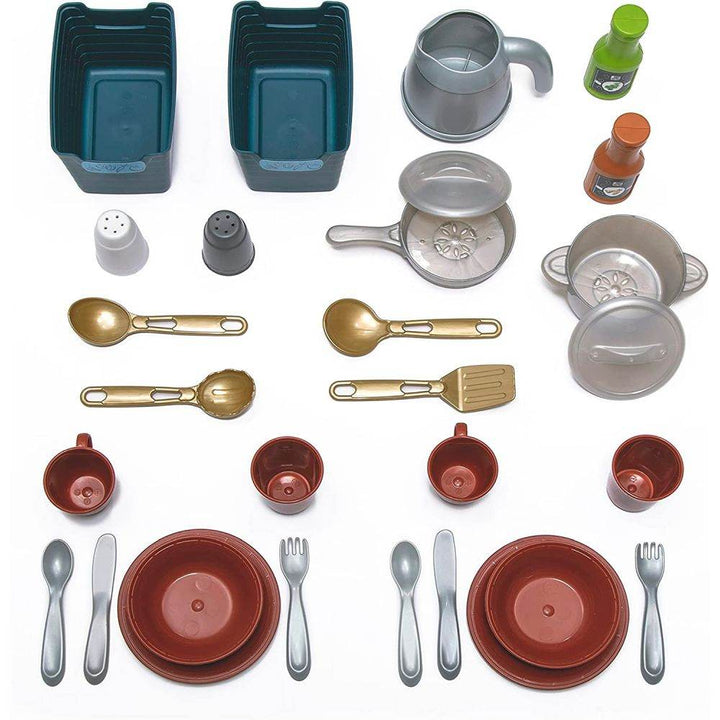 - In the box: Play kitchen with decals, 30-piece accessory set including cookware, dishes, stool, and more.