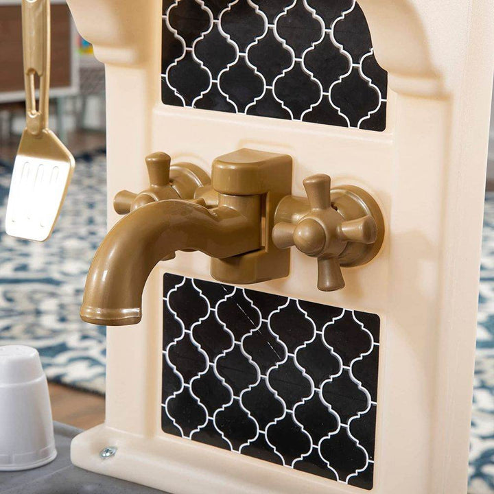 - Play kitchen design mimics home d?cor trends with features like realistic tile backsplash, faux gold faucet and appliance pulls, faux marble countertop inset, detailed range hood, and deep blue accents.