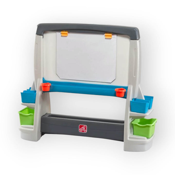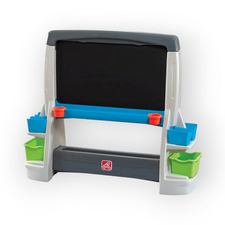 The Step2 Jumbo Art Easel is perfect for little artists to unleash their creativity! This kids art easel features a double-sided design with a chalkboard and dry-erase board for endless fun. Kids can display their masterpieces on the included large art clips. Ideal for developing fine motor skills through drawing, writing, and coloring. With large storage bins and built-in pockets for art supplies, this large easel for kids is perfect for organization and easy access to crayons, markers, and more. Made in the USA, with adult assembly required.