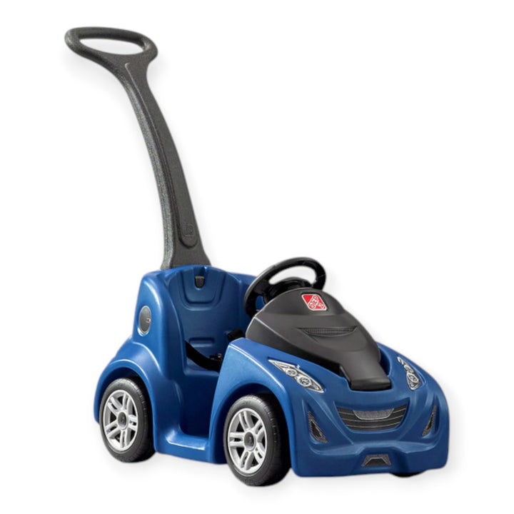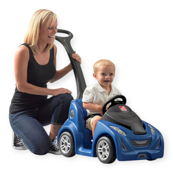 The Push Around Buggy GT™ is a great ride-on toy for mini car lovers that’s full of sports car attitude! Little ones will have a safe and comfortable adventure, pretending to steer and honking the horn while you push the car with the extra-wide grip handle. Buckle up with the included safety belt, use the molded-in cup holder for a favorite drink, and get cruising. For longer rides, pack snacks and toys in the extra storage space conveniently located under the hood. Ideal for use inside and outdoors, this kids’ push car is ready for any journey. Made in the USA of US and imported parts.