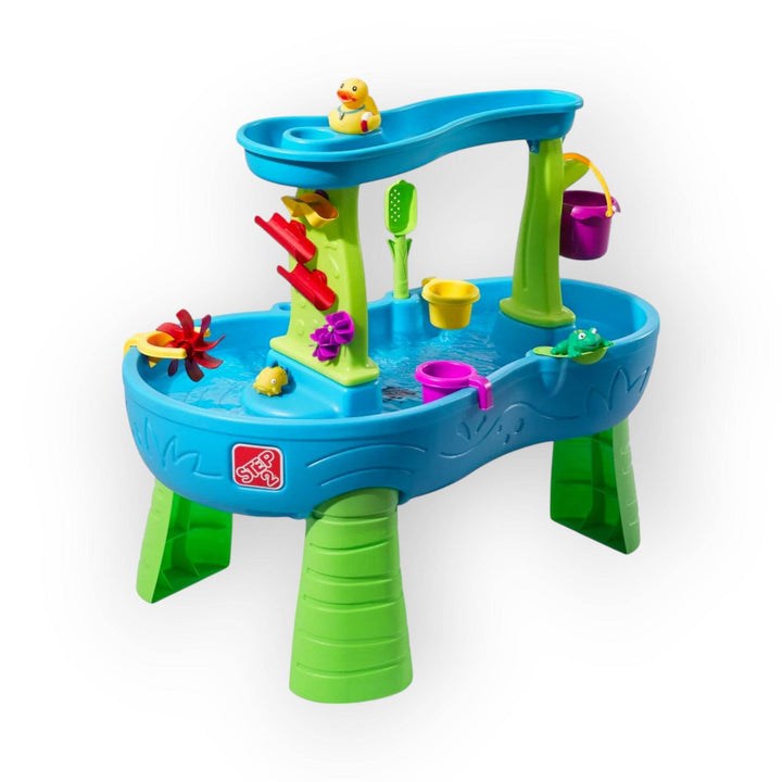 Create a mini water park right in your backyard with the Rain Showers Splash Pond Water Table by Step2. This two-tier toddler water table design creates a showering splash below! Just scoop up water from the pond and pour it into the top tray to make it rain. Watch as the rainfall activates the maze-like spinners and ramps, offering a fun way to explore cause and effect. From the side flipper to the put-and-place maze pieces, kids will have lots of splish-splash fun with the included water table accessories!