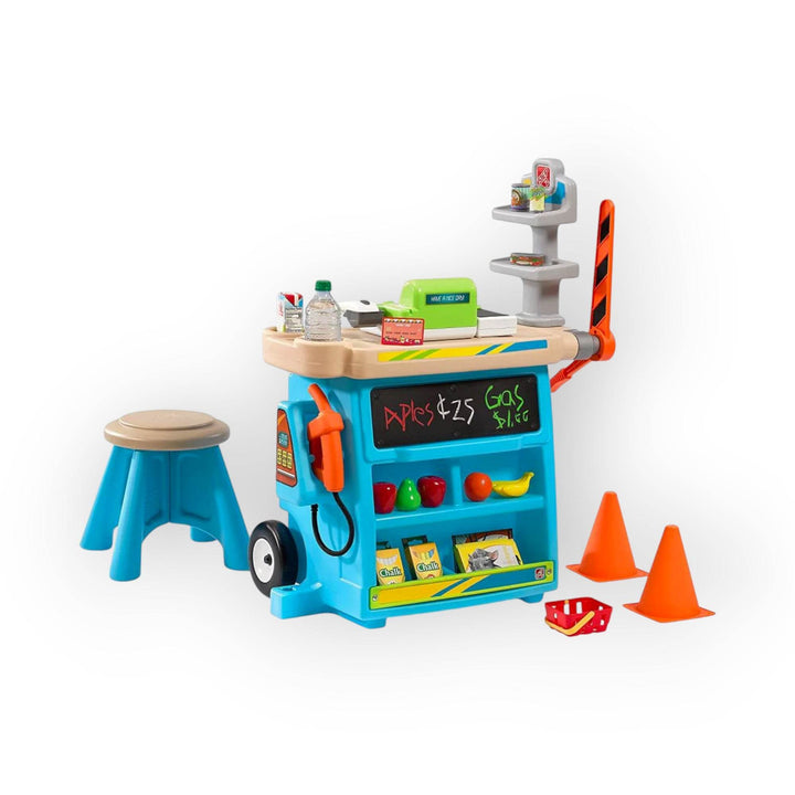 Little entrepreneurs will have a blast with the Step2 Stop & Go Market! This all-in-one pretend market includes a gas pump, tollbooth, cones, chalkboard, and a working cashier station, providing endless opportunities for imaginative play. Kids can role-play as the cashier or customer, fill up on gas, and pay the toll, all while using the chalkboard to write out daily specials or gas prices. With an umbrella for sun protection and wheels for easy mobility, this kids market playset is perfect for outdoor fun. Ideal for teaching social skills, it’s a must-have kids shopping playset for your little one!