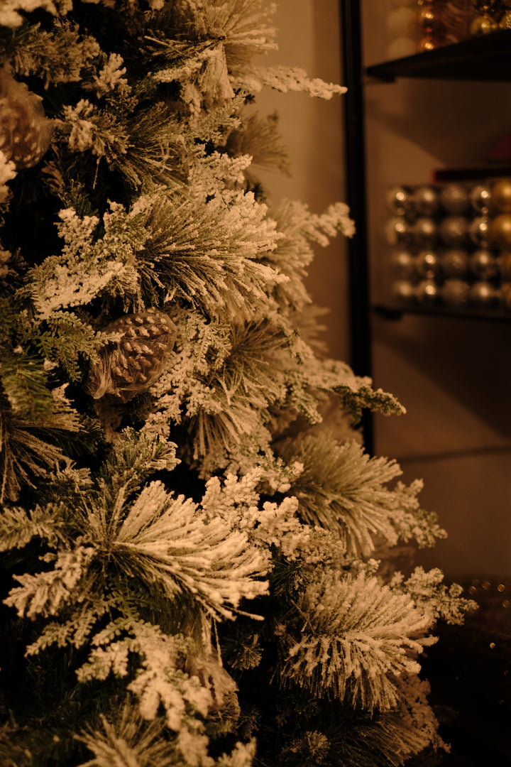 Adorn your home in a stunning, snow-covered dreamscape with the TRUE STAR christmas tree by SWEN. This captivating tree is heavily blanketed in pristine white flocking, evoking the breathtaking beauty of a truly frozen winter landscape, and is thoughtfully adorned with rustic natural pinecones. Each branch is crafted of beautfiul broad pine leaves that are generously layered with a dense, pristine white flocking, creating an incredibly realistic "fresh snowfall" effect. The charming natural pinecones nestled among the frosted branches add a touch of earthy warmth and complete its picturesque winter forest appeal. TRUE STAR is a beatifully voluminous tree that is made from premium Polythylene (PE) material. It is furnished with a sturdy metal stand for easy installtion and assembly. Simply place the stand provided on the floor and then place one component into the other by means of the central rod. The tree features hinged branches for incredibly easy assembly as well as for folding for storage. The branches quickly open up and fall into place, following which you may open up and orient the leaves in all directions giving it a full blown look ready for you to admire. Transforms your home into an enchanting arctic wonderland with TRUE STAR by SWEN.