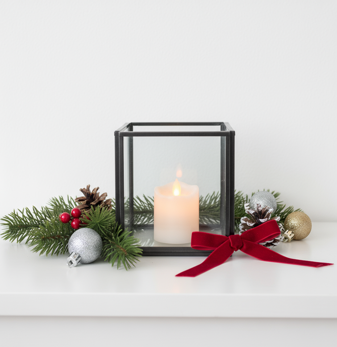 Introduce clean lines and contemporary style to your holiday display with LUCIAN, the modern geometric cube candle holder by SWEN. This versatile glass cube frame with an open design, perfect for showcasing tea light candles, pillar candles, jar candles, or even small floral arrangements. LUCIAN is crafted from durable metal with a sleek matte black finish and glass walls, providing a stylish, high-contrast look that pairs well with traditional Christmas colors or monochromatic winter themes. The striking open-frame cube shape embodies rich modern aesthetics and makes LUCIAN ideal for versatile usage. Place small tea light, pillar or jar candles in it or house small holiday elements like pinecones, baubles, or LED string lights and treat yourself to a perfect contemporary christmas decor. Style your home with minimal design and instant elegance with LUCIAN by SWEN.