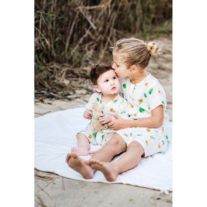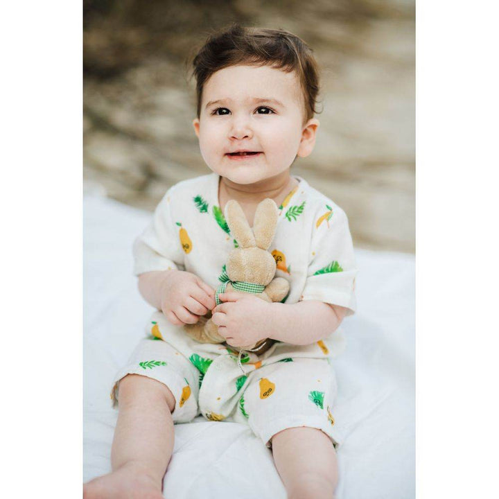 Our soft Poppet Pear essential rompers are made from the wonder fabric ? Organic Muslin that is breathable, super light and gets better with every wash, They are generously sized and comfortable and allow plenty of room for movement and growth. It?s designed with love and attention to details so that our little ones can truly enjoy the summer