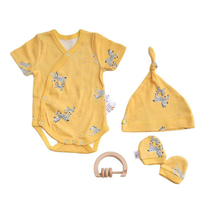 - 4-piece set; Halfsleeve Bodysuit, Knotted Cap, Mittens, Organic wooden Teether