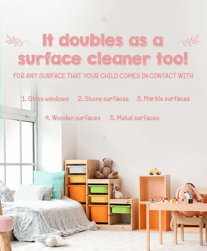 Your baby’s tiny fingers love exploring everything in their path, and will touch everything that comes in the way. Once done, those fingers will somehow find a way into their mouths! Our natural toy and multi-surface cleaner will take the stress out of such exploration, ensuring that any surface - glass, plastic, steel, wood, or stone - will be free of any dirt or harmful residues. Oh, and this is beneficial to not only your tiny tots but also if you have any pets.