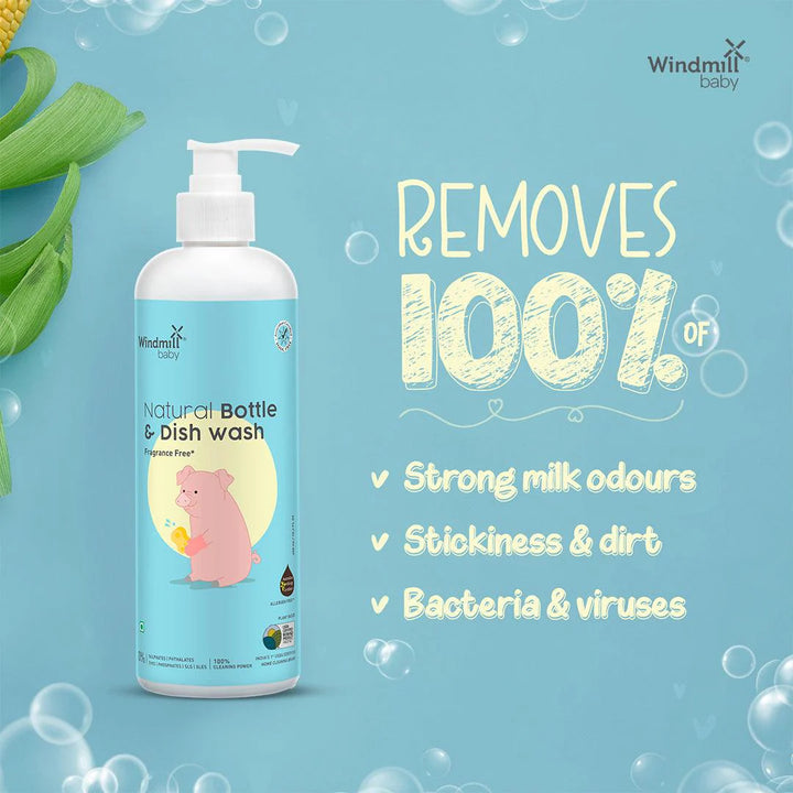 Windmill baby Natural Baby Bottle Cleaning Liquid foams nicely and cuts through grime and solidified milk to leave your bottles and pump parts germ free and odour free. It is specially formulated to remove germs, viruses and milk odors while being gentle on your hands and non irritant for your baby. Made with loving ingredients that are tough on dirt and kind on tongues. Oh, and it doubles up as dish wash too so no more dirty plates, cups, and bowls - ever!