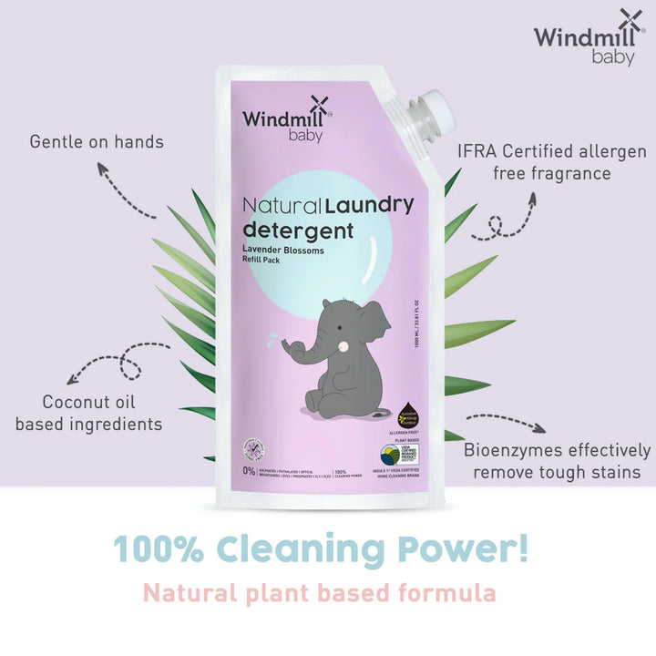 Windmill baby Natural Baby Laundry Detergent is the most natural way to clean your little superhero's clothes. Its germ, stain and filth fighting goodness goes deep beteen the layers of fabric and lifts out dirt, leaving your baby's clothes spotless clean without harming them.