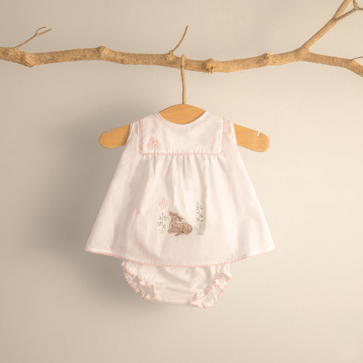 Step into a world of snuggles and storybook charm with our Woodland Summer Cotton Collection a must-have for your babys first adventures. Crafted from soft, breathable 100% cotton, this darling dress brings the magic of the forest to life with delicate woodland animal motifs and nature-inspired accents.