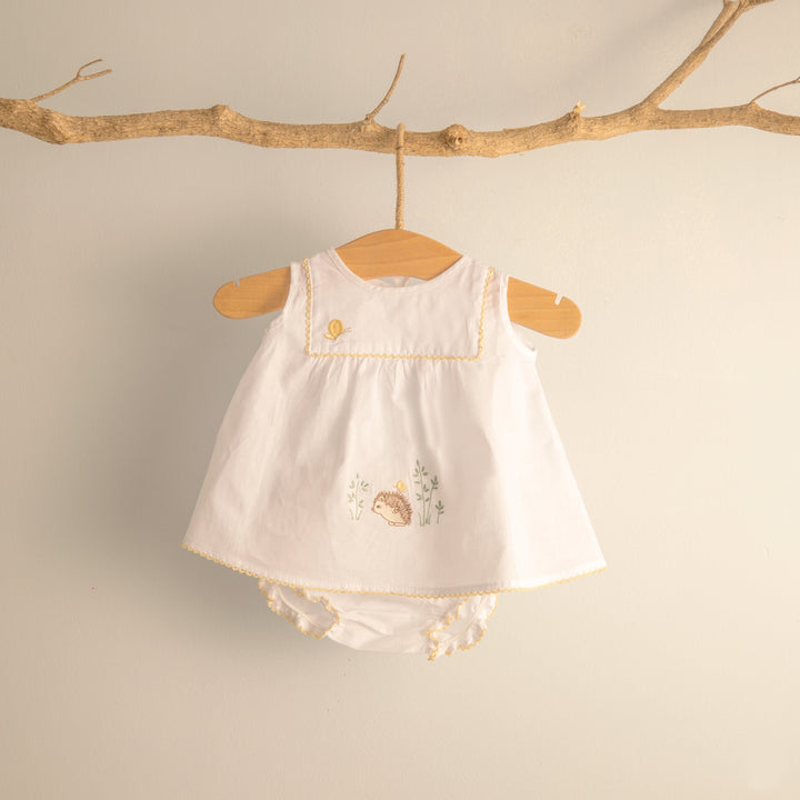 Step into a world of snuggles and storybook charm with our Woodland Summer Cotton Collection a must-have for your babys first adventures. Crafted from soft, breathable 100% cotton, this darling dress brings the magic of the forest to life with delicate woodland animal motifs and nature-inspired accents.