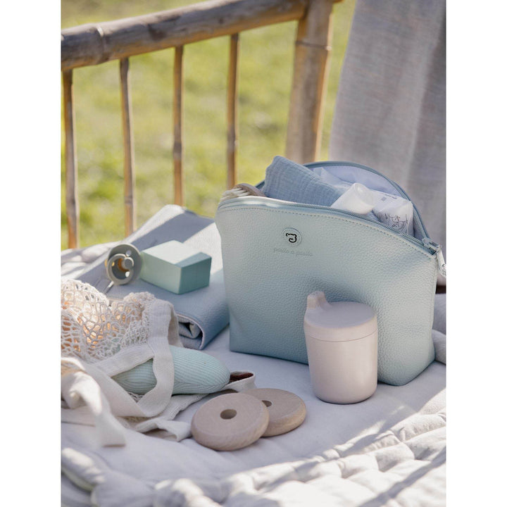 This multipurpose travel pouch is made of soft faux eco leather, which is waterproof. It has a single main compartment to organize your baby's hygiene products or wet clothes. The inside lining can be easily wiped clean. The bag can be washed by hand or machine at 30 °C. The materials used are free of azo dyes, phthalates and substances harmful to health.